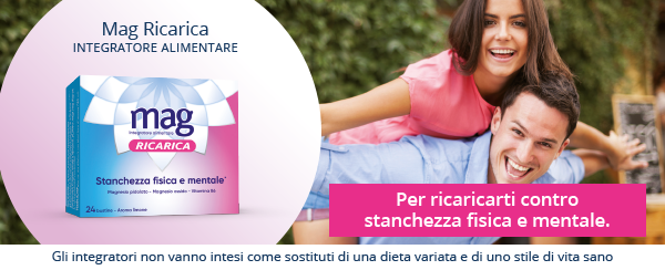 A volte l’alimentazione non è sufficiente a fornire il giusto apporto di magnesio. In questi casi può essere utile l’assunzione di Mag Ricarica, integratore alimentare a base di Magnesio, in comode bustine orosolubili.